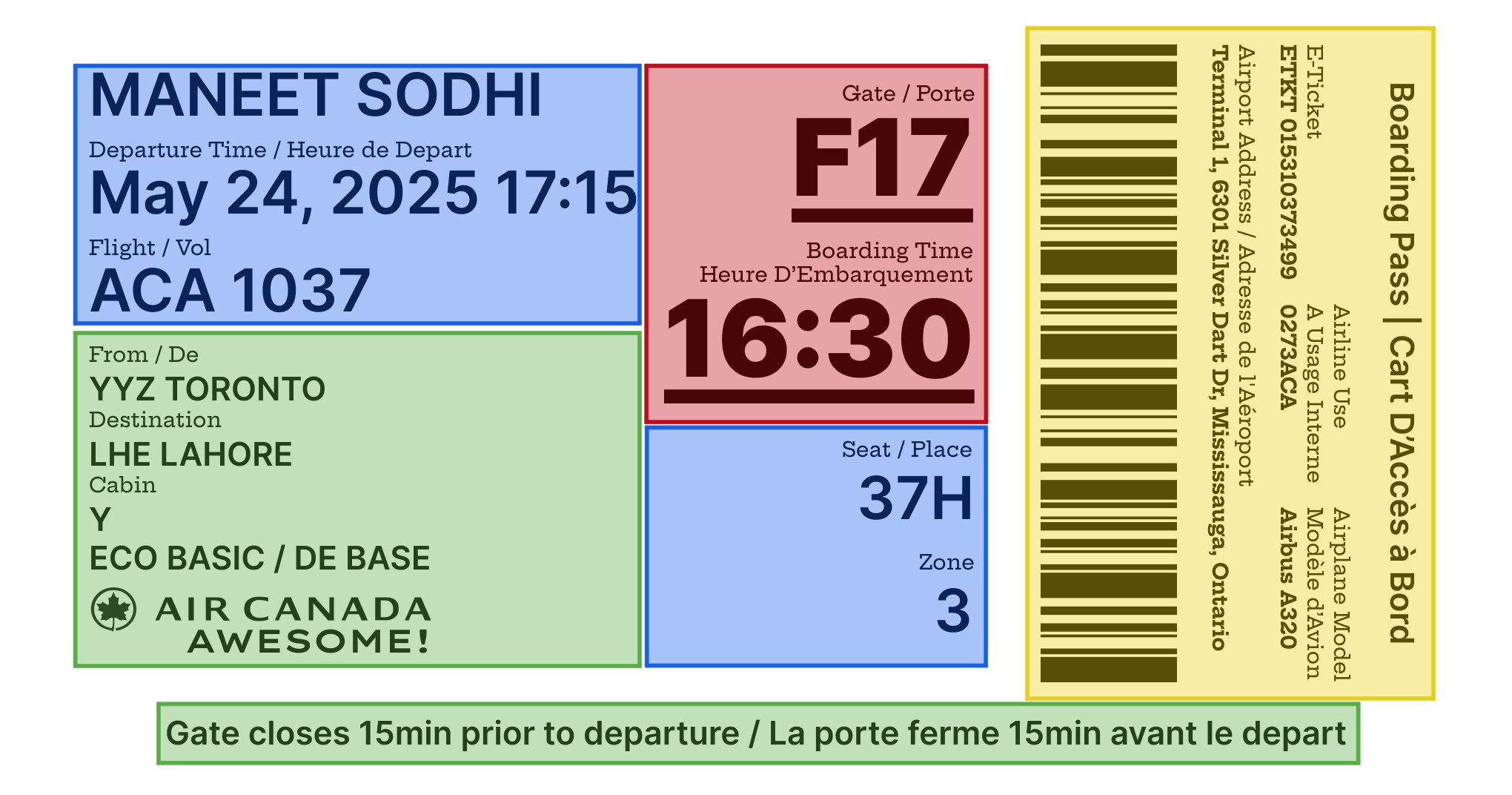 Additionally, the labels are written in both English and French for increased accessibility. I also decided that the name on the boarding pass should be “first name” and then “last name” as this would decrease the words needed to be read/skipped over before the main differentiator is read, especially for passengers flying as families.