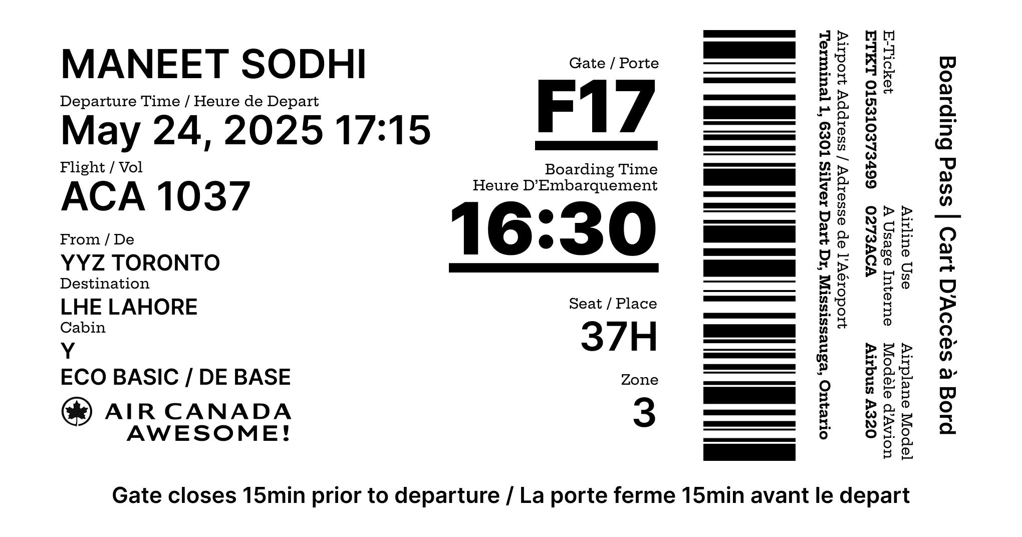 • "Gate closes 15 mins prior to departure"