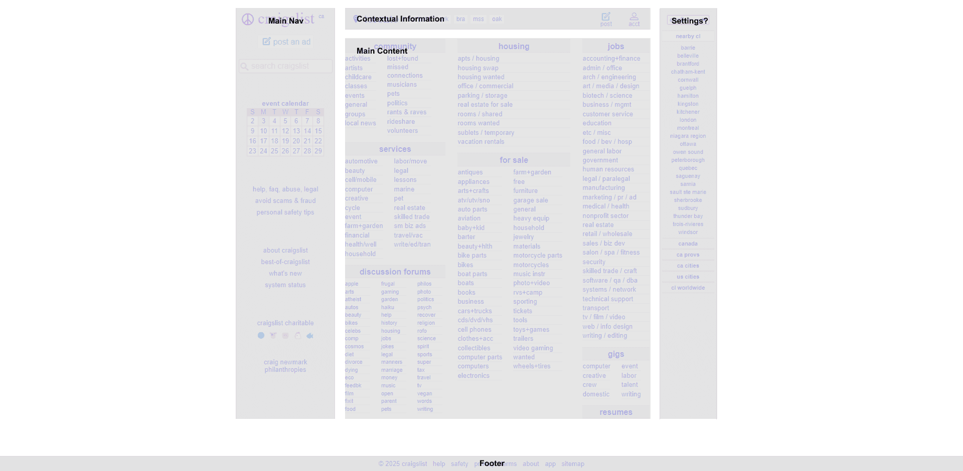 Hick’s law states that the more options a person has, the longer it will take them to make a decision. In the context of Craigslist, the user is faced with way too many options (I counted 243 blue links!) right from the home page. The human brain has a limited capacity to process information, meaning Craigslist’s bombardment of links, though practical, is a complete violation of this law. This law is especially relevant to designing navigational structures (which is this entire homepage) as they will be key in whether a user feels confident they can complete their intended task. Although the current website design attempts to reduce the mental load by creating groups of information, visually there are just too many groups. Even when this grouping is viewed at the highest level, having four major sections is just too distracting for the user, especially when all the links and options in these sections are treated equally to each other. From the original website, we can also see how under-utilized the footer is. This can be a good place to “put away” information that isn’t commonly needed by users and therefore free up some of the “prime real-estate”.